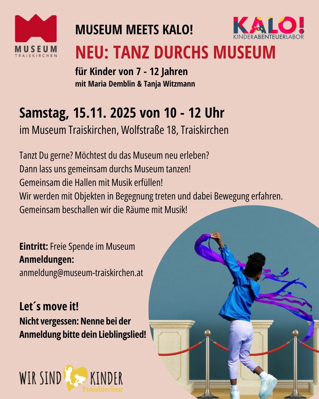 Tanzt Du gerne? Möchtest du das „Museum“ neu erleben? Dann lass uns gemeinsam durchs Museum tanzen! Gemeinsam die Hallen mit Musik erfüllen! Wir werden mit Objekten in Begegnung treten und dabei Bewegung erfahren. Gemeinsam beschallen wir die Räume mit Musik!